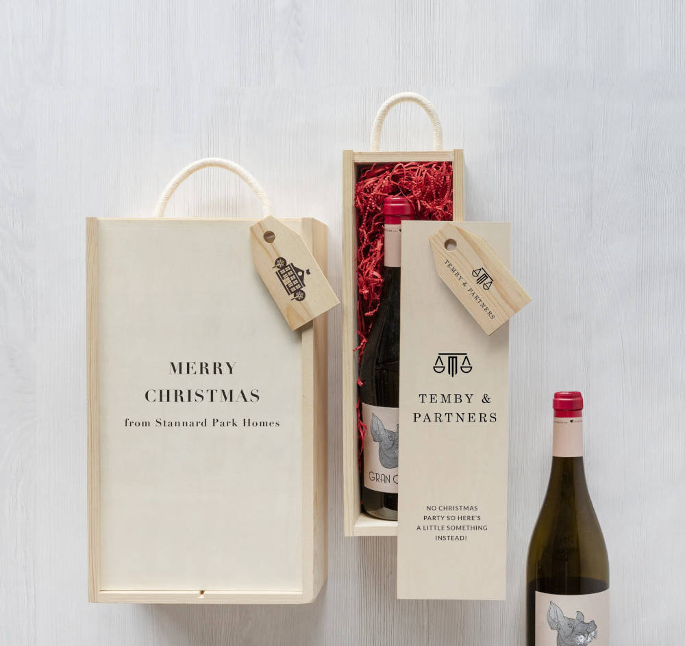 Most of our wooden boxes are designed to fit a standard wine and Champagne bottle with a maximum size for 90 x 330mm. Don’t forget to turn this box into an elegant gift by adding one of our pre-printed gift tags or lids. And if you’re sending it out to staff, our specially designed protective outers will ensure they arrive in tip-top shape every time.
