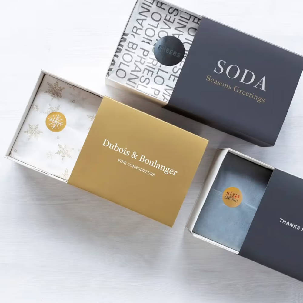 How classy are these? These rigid cartons for corporate gifting come pre-assembled for instant gifting. Ready-made and ready to go.