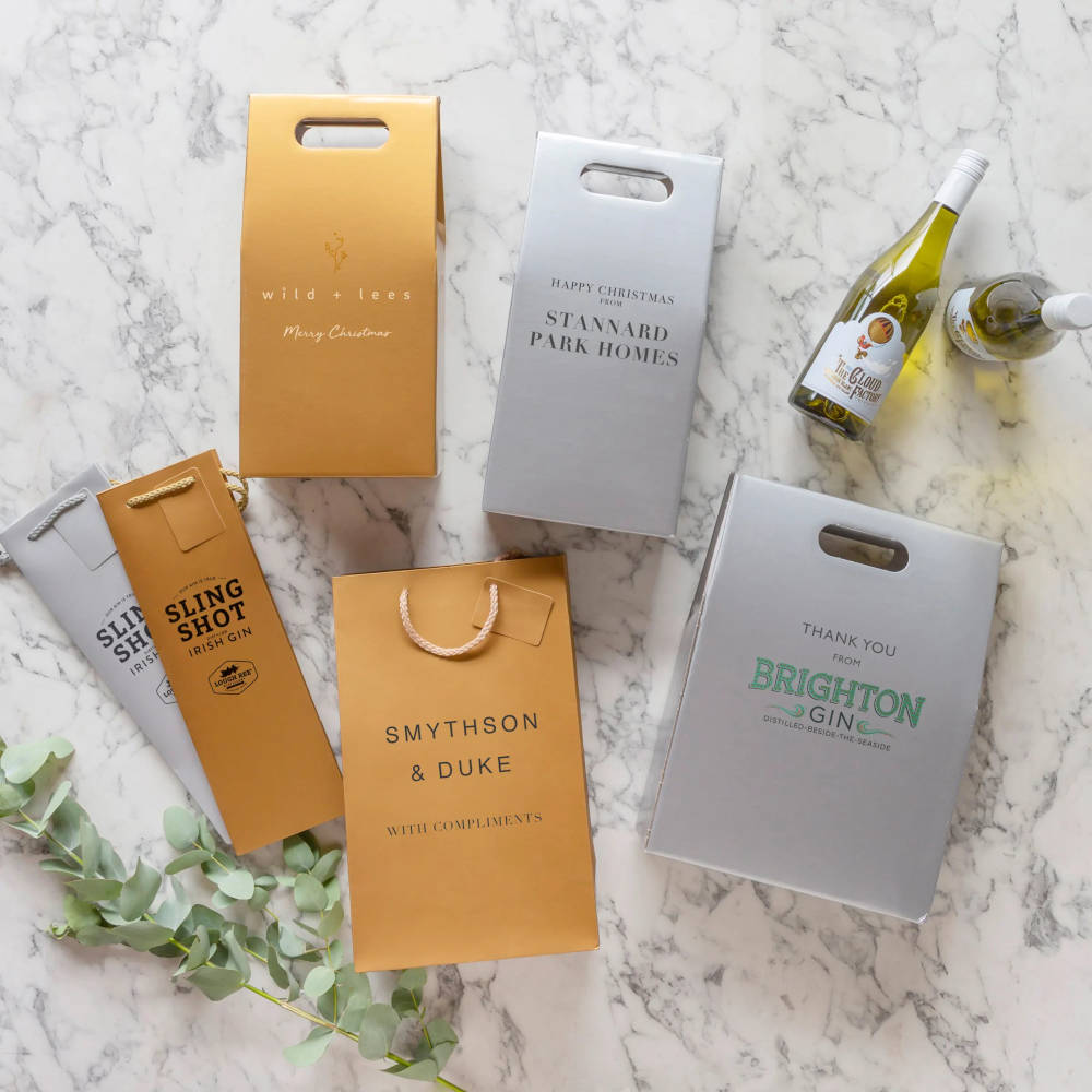 All our bottle bags are 100% recyclable and designed to fit up to a standard bottle of Champagne. They come with a matching gift tag for personalisation and you can choose plain versions or we can print them with your company name or logo in 7 days.
