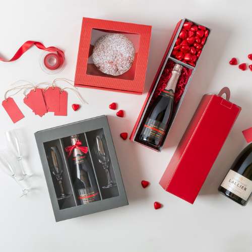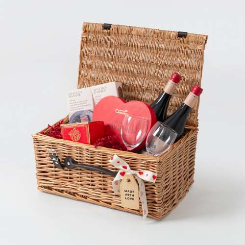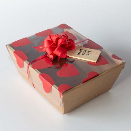 Put a twist on traditional hampers with heart-shaped kraft boxes. They’re available in different sizes and you can fill them up with vibrant red shred topped with gifts like chocolates, liqueurs, sauces or a selection of jams.