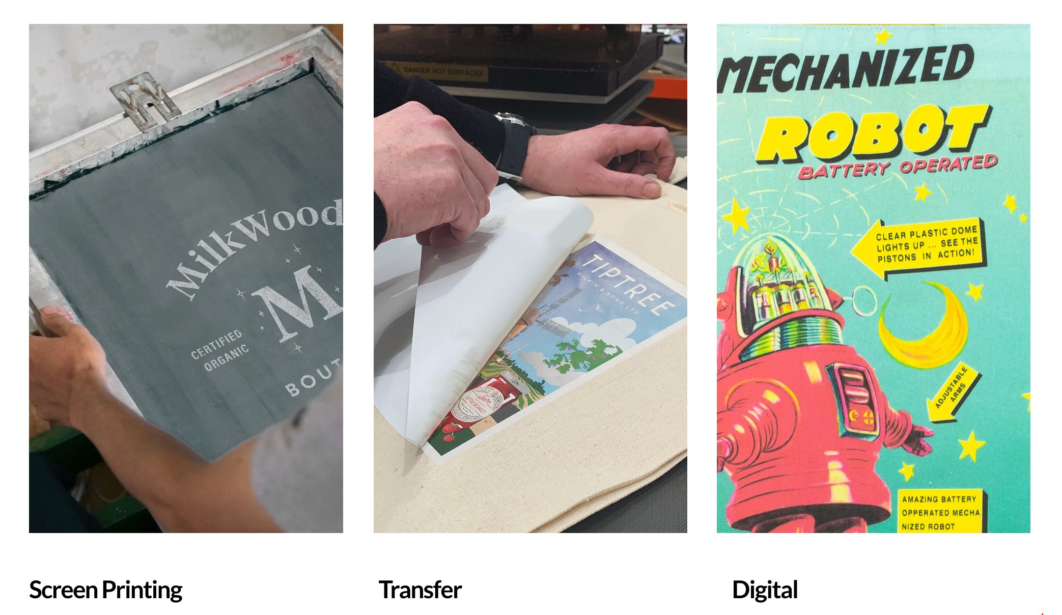 Screen printing: Vibrant and full of depth, this is our most cost-effective offering and uses hand-mixed, AZO-free inks to complete the process.