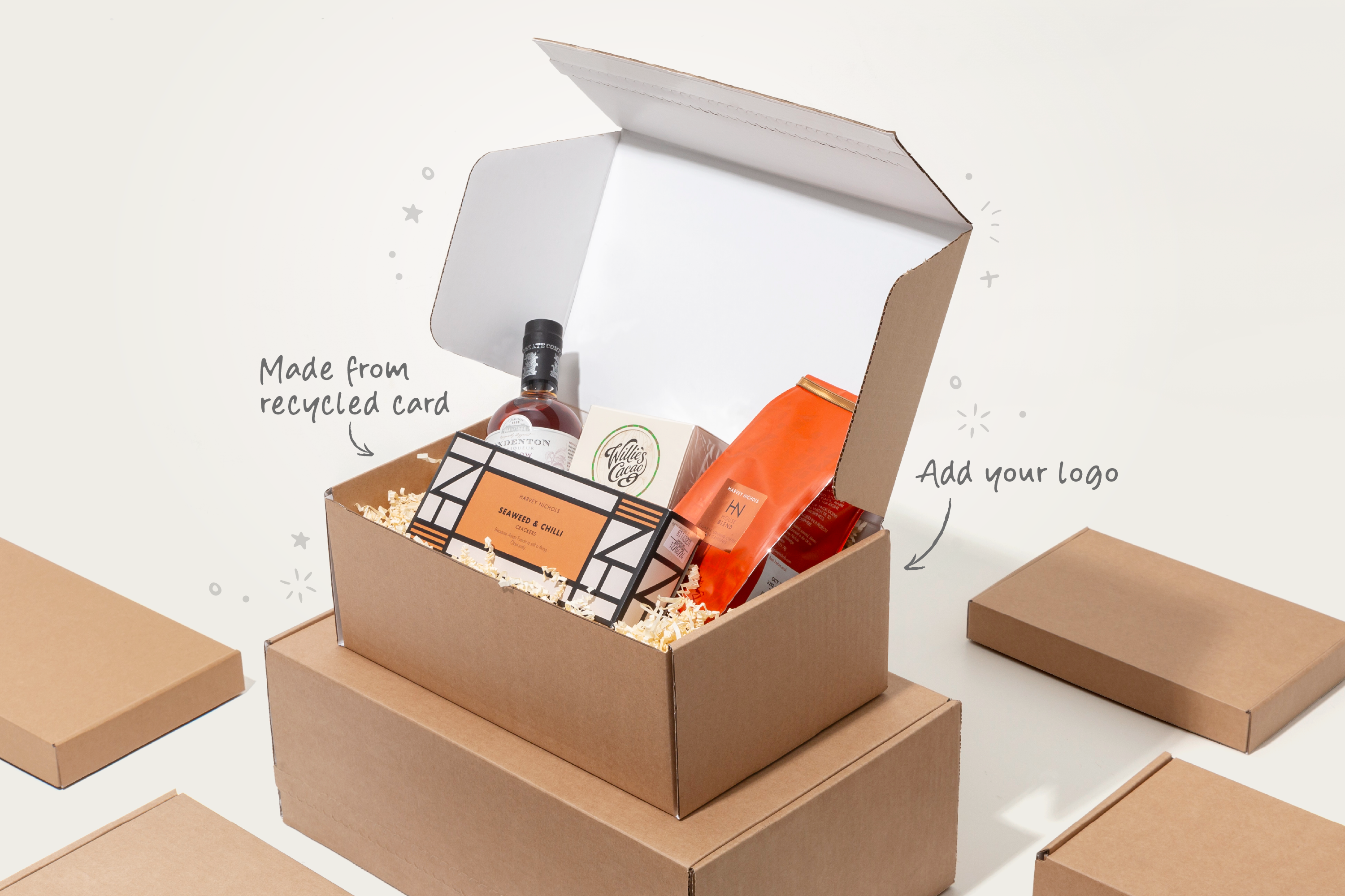 Creating memorable unboxing experiences is all about safe product delivery – and that’s what our ecommerce hamper boxes will do for you. Crafted from recycled card, they are strong, self-sealing and can be personalised to make an impression that lasts.